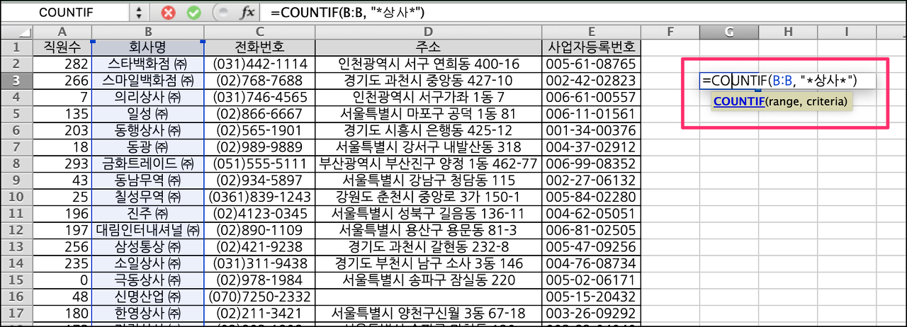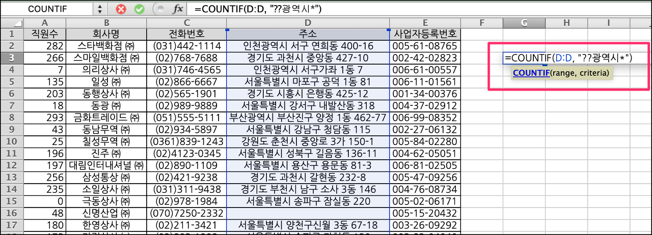 "??광역시*" 라고 매칭하면 광역시 라는 단어앞에 두글자가 오는 패턴으로 매칭하니까, 부산광역시~, 인천광역시~ 와 같은 주소가 매칭이 된다. 이렇게 countif 함수를 활용하면 각 셀 데이터의 패턴에 맞는 데이터의 건수를 알수 있게 된다. 이상으로 엑셀 COUNTIF 사용법에 대해서 간략히 알아보았습니다.