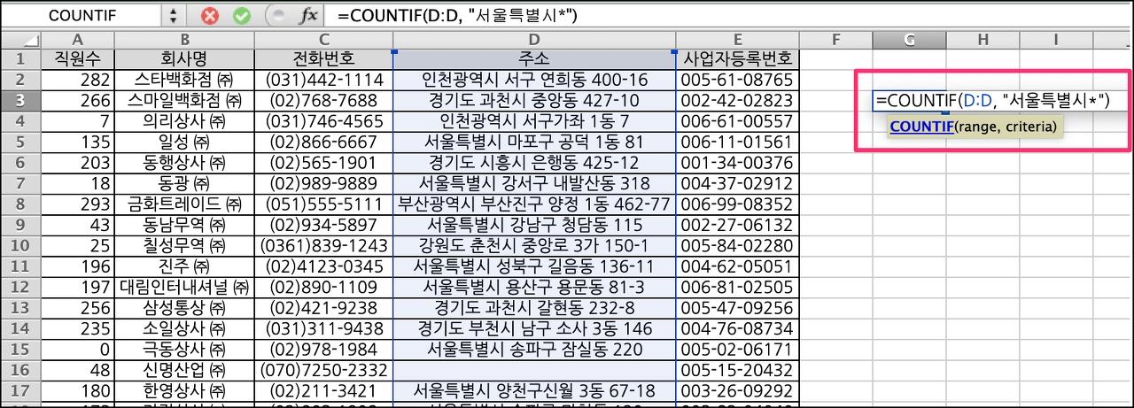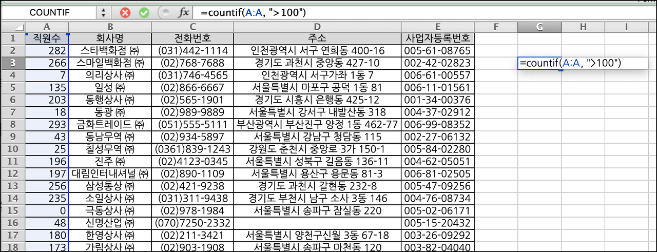 직원수 칼럼에서 100명 이상인 것만 카운트 하고 싶으면 "=countif(A:A, ">100")" 라고 표현하면 된다. 첫번째 인수로는 데이터 범위를 설정하고 두번째 인수로 조건을 명시하면 된다. 조건 명시할때는 "" 따옴표로 감싸고 표현하면 된다.